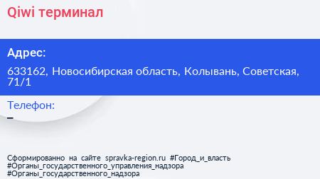 Qiwi, терминал по адресу 633162, Новосибирская область, Колывань, Советская, 71/1 в дальнейшем Организация, размещена в следующих категориях: