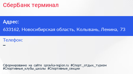 СберБанк, терминал по адресу 633162, Новосибирская область, Колывань, Ленина, 73 в дальнейшем Организация, размещена в следующих категориях: