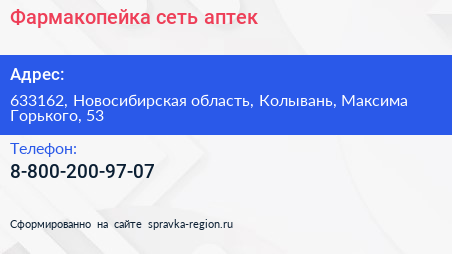 Фармакопейка, сеть аптек по адресу 633162, Новосибирская область, Колывань, Максима Горького, 53 в дальнейшем Организация, размещена в следующих категориях: