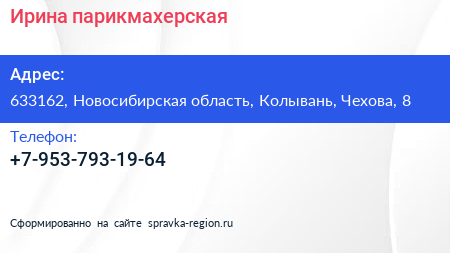 Ирина, парикмахерская по адресу 633162, Новосибирская область, Колывань, Чехова, 8 в дальнейшем Организация, размещена в следующих категориях: