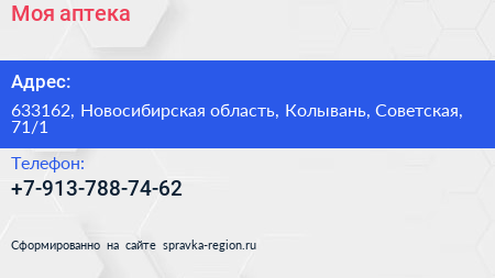 Моя аптека по адресу 633162, Новосибирская область, Колывань, Советская, 71/1 в дальнейшем Организация, размещена в следующих категориях: