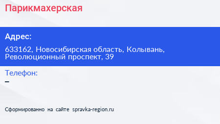 Парикмахерская по адресу 633162, Новосибирская область, Колывань, Революционный проспект, 39 в дальнейшем Организация, размещена в следующих категориях: