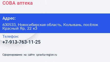 СОВА, аптека по адресу 630533, Новосибирская область, Колывань, посёлок Красный Яр, 22 к3 в дальнейшем Организация, размещена в следующих категориях: