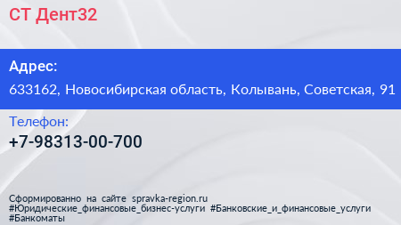 СТ-Дент32 по адресу 633162, Новосибирская область, Колывань, Советская, 91 в дальнейшем Организация, размещена в следующих категориях: