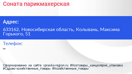 Соната, парикмахерская по адресу 633162, Новосибирская область, Колывань, Максима Горького, 51 в дальнейшем Организация, размещена в следующих категориях:
