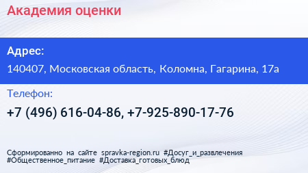 Академия оценки по адресу 140407, Московская область, Коломна, Гагарина, 17а в дальнейшем Организация, размещена в следующих категориях: