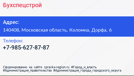 Бухспецстрой по адресу 140408, Московская область, Коломна, Дорфа, 6 в дальнейшем Организация, размещена в следующих категориях: