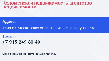 Коломенская недвижимость, агентство недвижимости по адресу 140410, Московская область, Коломна, Фрунзе, 46 в дальнейшем Организация, размещена в следующих категориях: