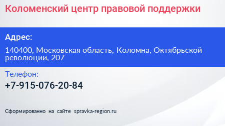 Коломенский центр правовой поддержки по адресу 140400, Московская область, Коломна, Октябрьской революции, 207 в дальнейшем Организация, размещена в следующих категориях: