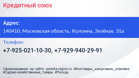 Кредитный союз по адресу 140410, Московская область, Коломна, Зелёная, 31а в дальнейшем Организация, размещена в следующих категориях: