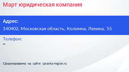 Март, юридическая компания по адресу 140402, Московская область, Коломна, Ленина, 55 в дальнейшем Организация, размещена в следующих категориях: