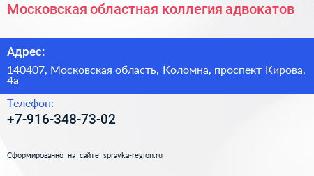 Московская областная коллегия адвокатов по адресу 140407, Московская область, Коломна, проспект Кирова, 4а в дальнейшем Организация, размещена в следующих категориях: