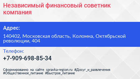 Независимый финансовый советник, компания по адресу 140402, Московская область, Коломна, Октябрьской революции, 404 в дальнейшем Организация, размещена в следующих категориях: