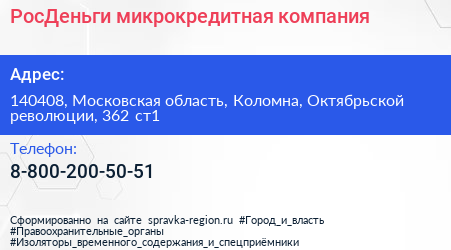 РосДеньги, микрокредитная компания по адресу 140408, Московская область, Коломна, Октябрьской революции, 362 ст1 в дальнейшем Организация, размещена в следующих категориях: