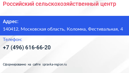 Российский сельскохозяйственный центр по адресу 140412, Московская область, Коломна, Фестивальная, 4 в дальнейшем Организация, размещена в следующих категориях: