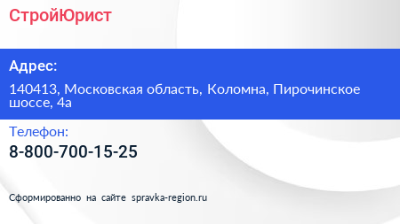 СтройЮрист по адресу 140413, Московская область, Коломна, Пирочинское шоссе, 4а в дальнейшем Организация, размещена в следующих категориях: