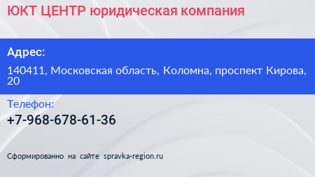ЮКТ-ЦЕНТР, юридическая компания по адресу 140411, Московская область, Коломна, проспект Кирова, 20 в дальнейшем Организация, размещена в следующих категориях: