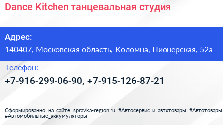 Dance Kitchen, танцевальная студия по адресу 140407, Московская область, Коломна, Пионерская, 52а в дальнейшем Организация, размещена в следующих категориях:
