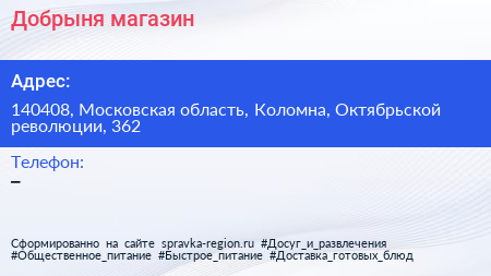 Добрыня, магазин по адресу 140408, Московская область, Коломна, Октябрьской революции, 362 в дальнейшем Организация, размещена в следующих категориях: