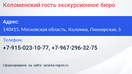 Коломенский гость, экскурсионное бюро по адресу 140415, Московская область, Коломна, Пионерская, 5 в дальнейшем Организация, размещена в следующих категориях: