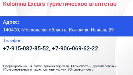 Kolomna-Excurs, туристическое агентство по адресу 140400, Московская область, Коломна, Исаева, 29 в дальнейшем Организация, размещена в следующих категориях: