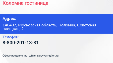 Коломна, гостиница по адресу 140407, Московская область, Коломна, Советская площадь, 2 в дальнейшем Организация, размещена в следующих категориях: