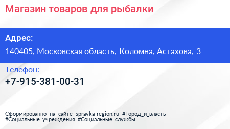 Магазин товаров для рыбалки по адресу 140405, Московская область, Коломна, Астахова, 3 в дальнейшем Организация, размещена в следующих категориях:
