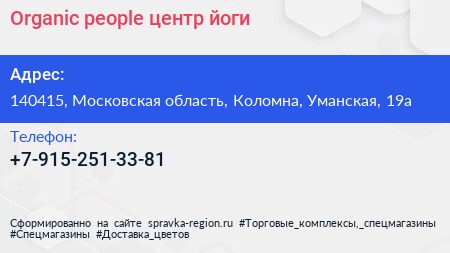 Organic people, центр йоги по адресу 140415, Московская область, Коломна, Уманская, 19а в дальнейшем Организация, размещена в следующих категориях:
