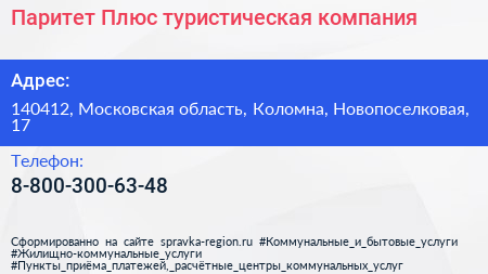 Паритет Плюс, туристическая компания по адресу 140412, Московская область, Коломна, Новопоселковая, 17 в дальнейшем Организация, размещена в следующих категориях: