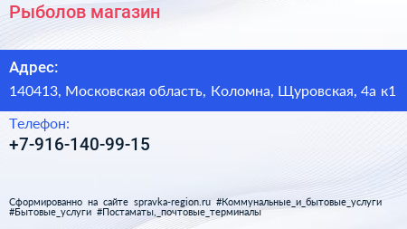 Рыболов, магазин по адресу 140413, Московская область, Коломна, Щуровская, 4а к1 в дальнейшем Организация, размещена в следующих категориях: