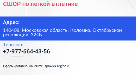 СШОР по легкой атлетике по адресу 140408, Московская область, Коломна, Октябрьской революции, 324Б в дальнейшем Организация, размещена в следующих категориях: