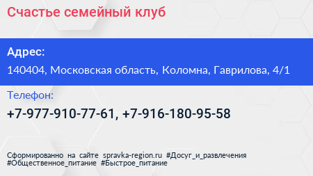 Счастье, семейный клуб по адресу 140404, Московская область, Коломна, Гаврилова, 4/1 в дальнейшем Организация, размещена в следующих категориях:
