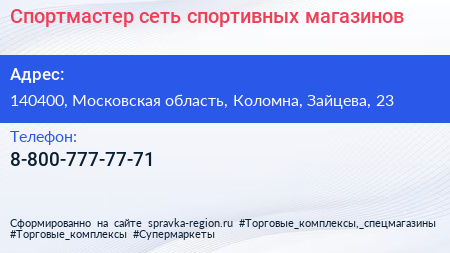 Спортмастер, сеть спортивных магазинов по адресу 140400, Московская область, Коломна, Зайцева, 23 в дальнейшем Организация, размещена в следующих категориях: