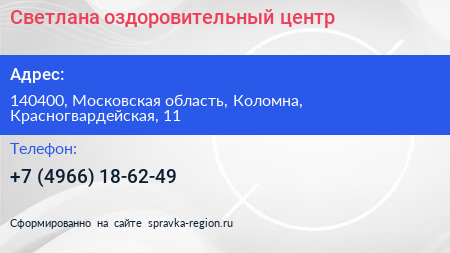 Светлана, оздоровительный центр по адресу 140400, Московская область, Коломна, Красногвардейская, 11 в дальнейшем Организация, размещена в следующих категориях: