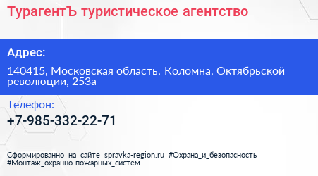 ТурагентЪ, туристическое агентство по адресу 140415, Московская область, Коломна, Октябрьской революции, 253а в дальнейшем Организация, размещена в следующих категориях: