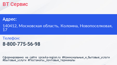 ВТ-Сервис по адресу 140412, Московская область, Коломна, Новопоселковая, 17 в дальнейшем Организация, размещена в следующих категориях: