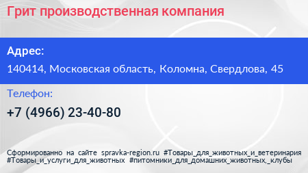 Грит, производственная компания по адресу 140414, Московская область, Коломна, Свердлова, 45 в дальнейшем Организация, размещена в следующих категориях:
