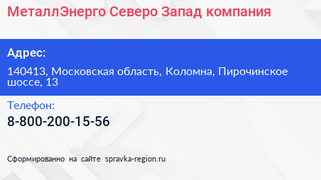 МеталлЭнерго Северо-Запад, компания по адресу 140413, Московская область, Коломна, Пирочинское шоссе, 13 в дальнейшем Организация, размещена в следующих категориях: