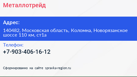 Металлотрейд по адресу 140482, Московская область, Коломна, Новорязанское шоссе 110 км, ст1а в дальнейшем Организация, размещена в следующих категориях: