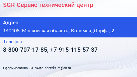 SGR Сервис, технический центр по адресу 140408, Московская область, Коломна, Дорфа, 2 в дальнейшем Организация, размещена в следующих категориях: