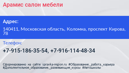 Арамис, салон мебели по адресу 140411, Московская область, Коломна, проспект Кирова, 78 в дальнейшем Организация, размещена в следующих категориях: