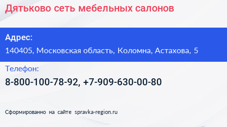 Дятьково, сеть мебельных салонов по адресу 140405, Московская область, Коломна, Астахова, 5 в дальнейшем Организация, размещена в следующих категориях: