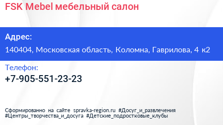 FSK-Mebel, мебельный салон по адресу 140404, Московская область, Коломна, Гаврилова, 4 к2 в дальнейшем Организация, размещена в следующих категориях: