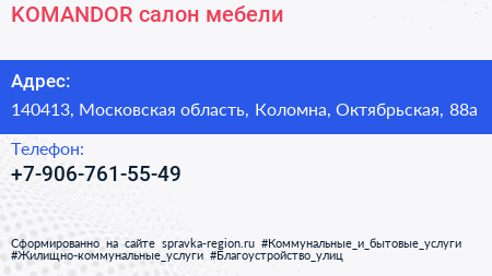 KOMANDOR, салон мебели по адресу 140413, Московская область, Коломна, Октябрьская, 88а в дальнейшем Организация, размещена в следующих категориях: