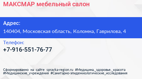 МАКСМАР, мебельный салон по адресу 140404, Московская область, Коломна, Гаврилова, 4 в дальнейшем Организация, размещена в следующих категориях: