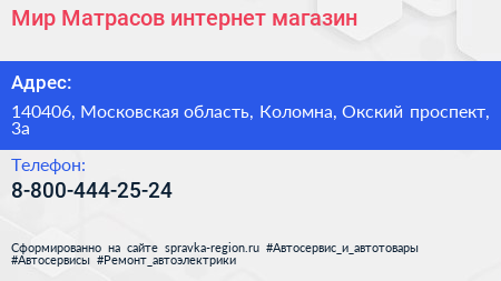Мир Матрасов, интернет-магазин по адресу 140406, Московская область, Коломна, Окский проспект, 3а в дальнейшем Организация, размещена в следующих категориях: