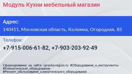 Модуль Кухни, мебельный магазин по адресу 140411, Московская область, Коломна, Огородная, 85 в дальнейшем Организация, размещена в следующих категориях:
