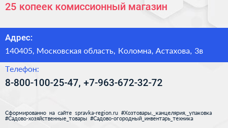25 копеек, комиссионный магазин по адресу 140405, Московская область, Коломна, Астахова, 3в в дальнейшем Организация, размещена в следующих категориях: