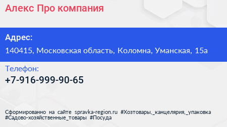 Алекс-Про, компания по адресу 140415, Московская область, Коломна, Уманская, 15а в дальнейшем Организация, размещена в следующих категориях: