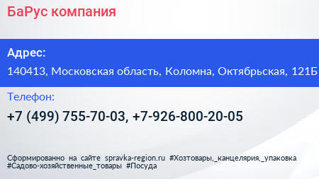 БаРус, компания по адресу 140413, Московская область, Коломна, Октябрьская, 121Б в дальнейшем Организация, размещена в следующих категориях: